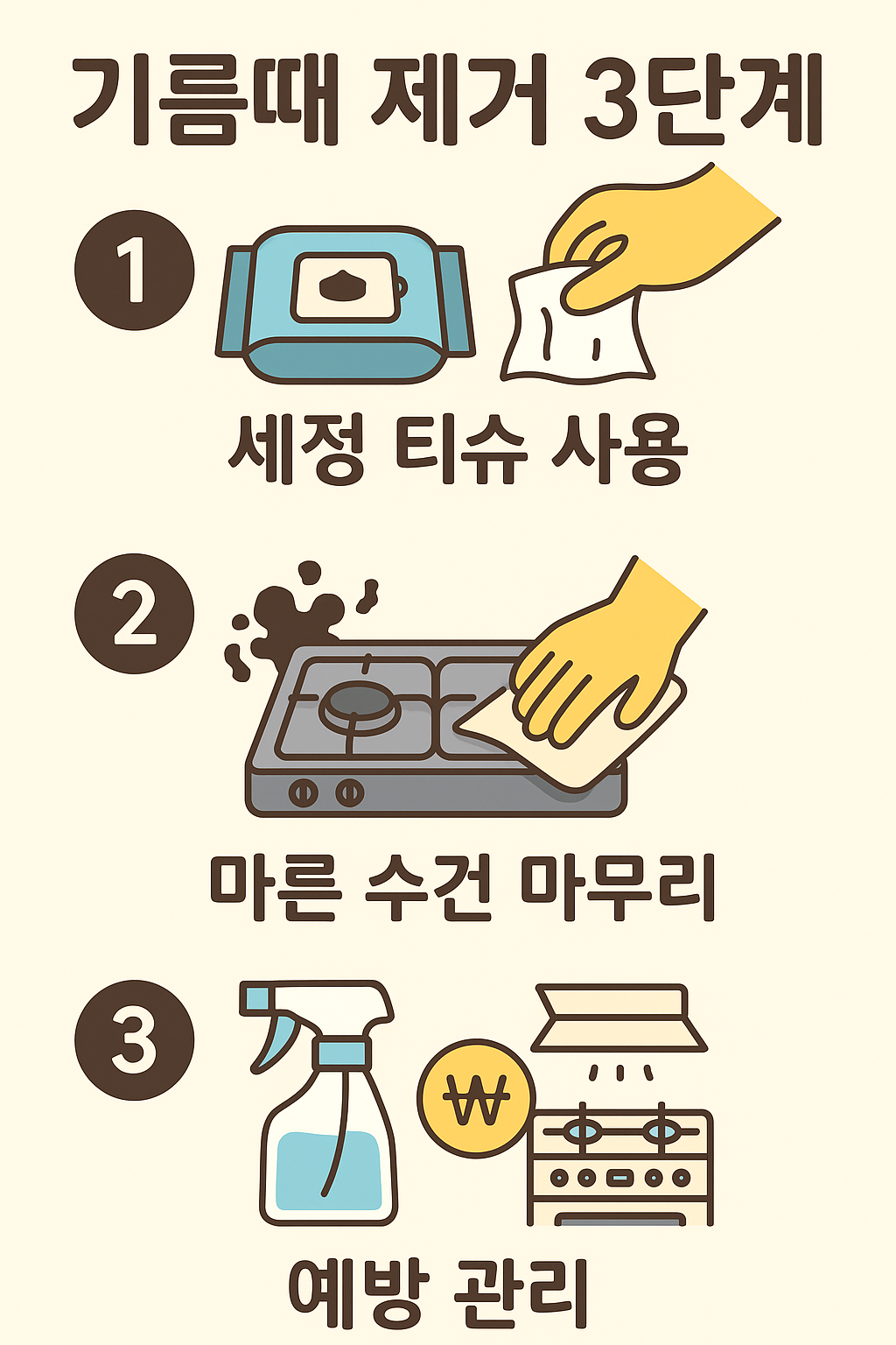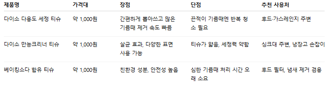 - 가스레인지 주변 → 묽은 기름 오염엔 다용도 세정티슈가 가장 간편.