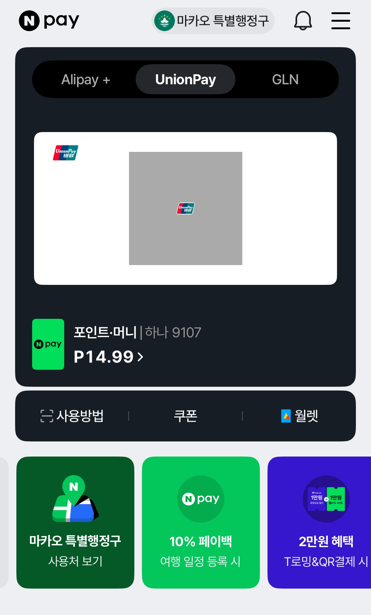 → 단, 카드 수수료나 최소 결제 조건이 있는 경우도 있으니, 소액 결제는 현금이 안전! - 카카오페이, 네이버 페이 : 알리페이플러서, 유니온페이 마크가 붙어있는 가게라면 카카오페이나 네이버페이 QR 혹은 바코드를 보여주면 결제를 할 수 있습니다.