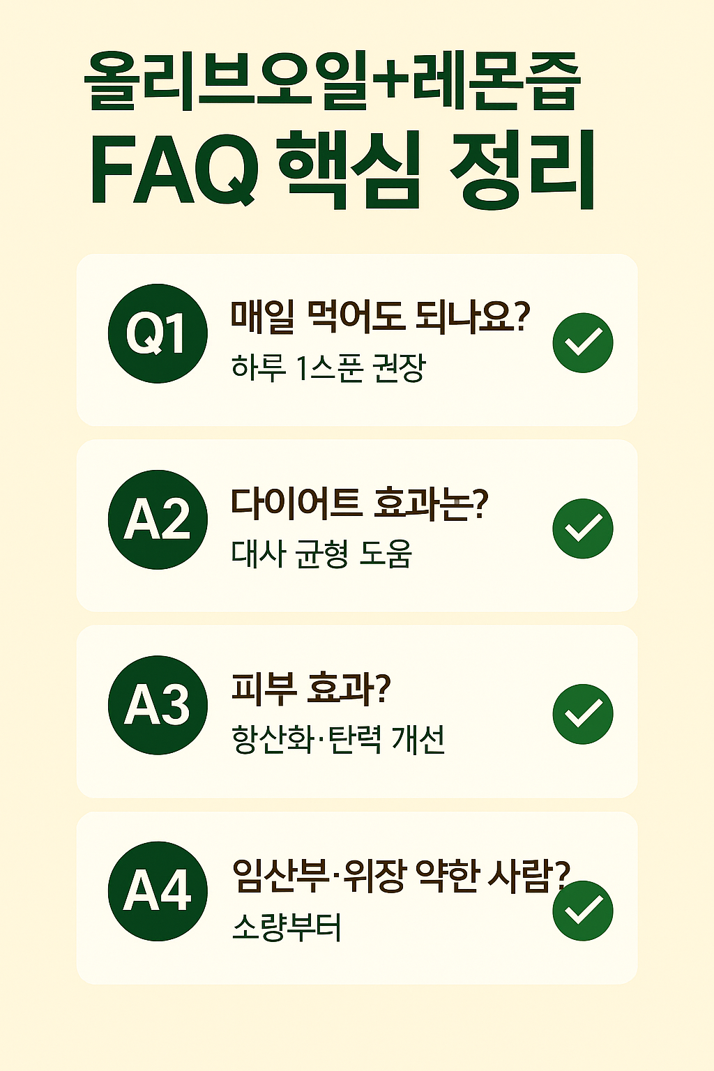 아침 공복 올리브오일+레몬즙 섭취에 대한 심화 FAQ 총정리! 과학적 근거, 부작용, 섭취 타이밍, 다이어트·피부 효과, 파미고·스틱 제품 선택 팁까지 모두 담은 꿀팁 가이드.