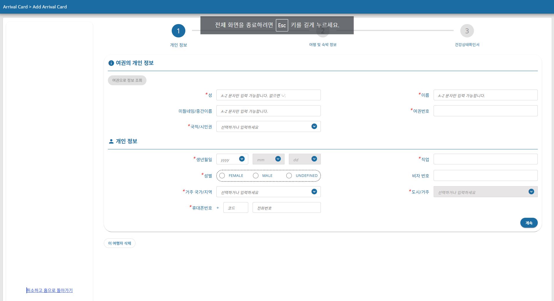 - 최근 방문 국가 입력 (예: Republic of Korea)