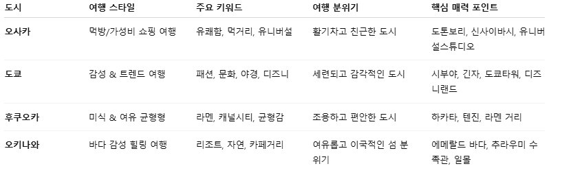 📌일본여행 도시별 핵심 비교 요약