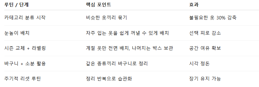 옷장 정리의 첫 단계는 **‘꺼내기 → 분류하기 → 보관하기’**입니다.